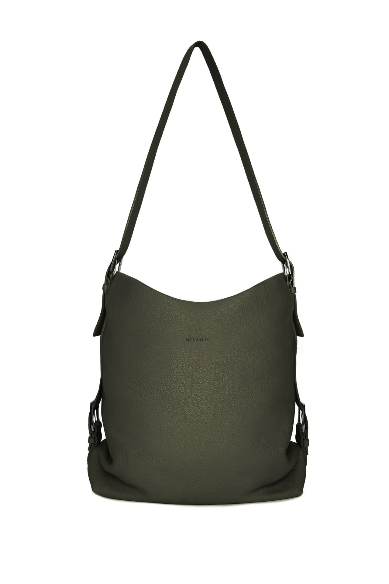 Szeroki pas na ramię ma ozdobne boczne klamry, a padka zamykana jest na ukryte magnesy — dyskretnie i z klasą. Na zewnętrznym korpusie znajduje się wytłoczone logo MILAMIE.